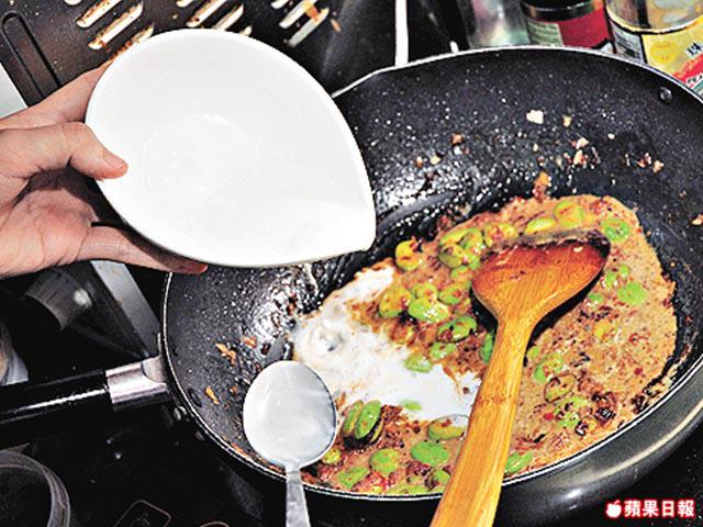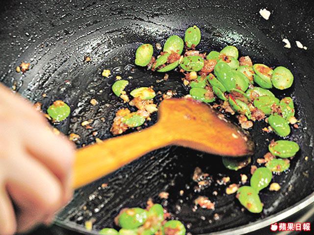 3.原鑊下蒜茸、乾葱,以中火炒香,加蝦米、花豆略炒。