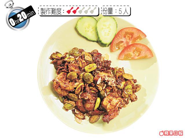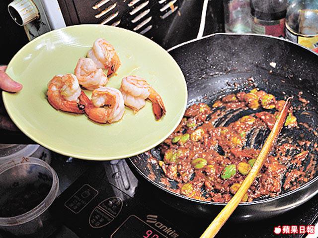 大蝦(去殼去腸)5隻、自製蝦米2茶匙、花豆(開半)60克、椰汁30毫升、辣椒醬1/2茶匙、酸子1磚、水30毫升、乾葱/蒜茸各2茶匙
