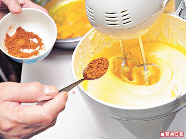 2. 繼續加入肉桂粉、煉奶、麪粉打勻,加入蛋白拌勻成粉漿。