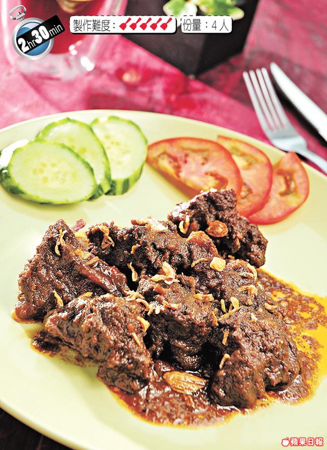 牛腩11/2斤、椰汁/冰糖/薑各適量、蒜茸/紅葱/芫荽籽/椰絲(炒香)各11/2湯匙、辣椒粉11/4湯匙、辣椒膏1/2湯匙、香茅6枝、沙冧葉1片、南薑2件、胡椒粉1茶匙