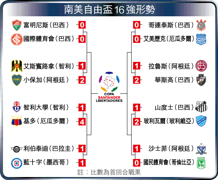 簡評:有尼馬及艾蘭奴等球星壓陣的山度士,首回合作客竟爆冷以1:2不敵玻利瓦爾,但手握一個作客入球,周四次回合只要小勝1:0也能出線,相信山度士返主場可收復失地;另外首回合作客領先一球的沙士菲,周二次回合回師主場更可看高一線,料可順利擊敗國民體育會晉級。