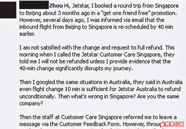 李先生購買捷星航空(Jetstar)香港來回新加坡機票4張,今年8月出發,共付3,387元。購票約三周後,捷星表示去程須延遲3.5小時,李先生接受;再過一周,又獲通知改回程時間,由原定凌晨2時多改為早上6時半,他擔心兩名幼子於機場熬夜,拒絕接受並要求退票,卻獲航空公司回覆只可退回程機票。他進退兩難,只好無奈接受,但不滿說:「Facebook好多人都有類似情況,但大家叫我慳返啖氣,因為捷星唔會理」。本報就上述個案向捷星航空查詢,惟截稿前未有回覆。