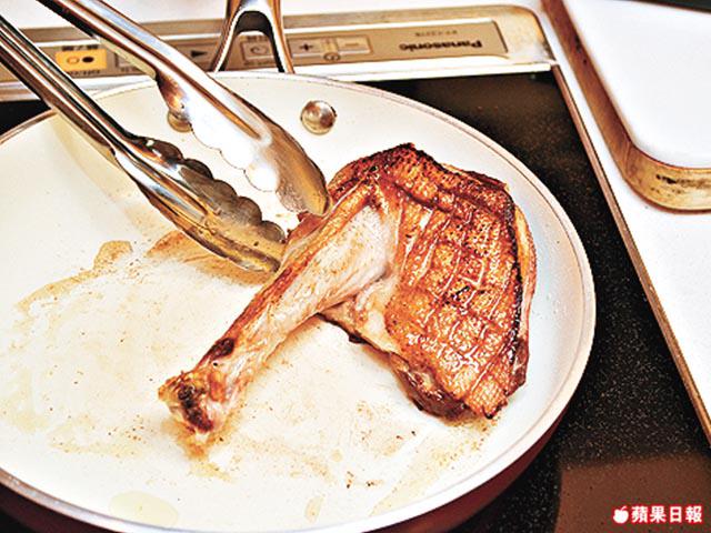 1.鵝胸表面成網紋,下黑椒碎調味,放入熱鑊中,煎香鵝胸並且逼出油份。