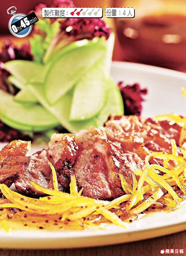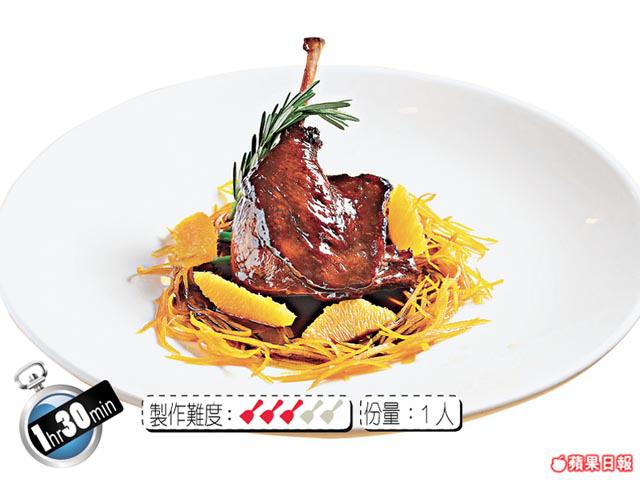 3.燒熱鑊下糖煮溶,加入醬汁煮至稠身,下橙酒拌勻,放入鵝髀略煮,盛起切件上碟,再淋上醬汁,伴以橙肉塊及橙皮絲,完成。