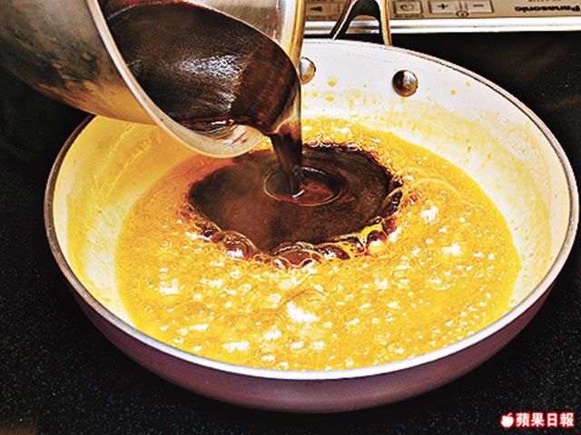 3.做蜜餞汁,燒熱鑊下糖、檸檬汁煮至轉焦糖色,倒入清水、檸皮絲和蜜糖煮至稠身,下芥末籽拌勻,盛起,淋上鵝胸。