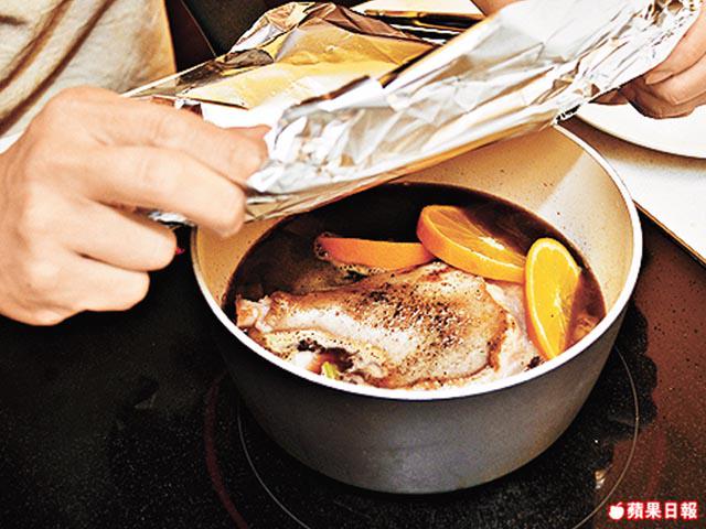 2.原鍋下甘笋粒、西芹粒、洋葱粒,炒至軟身,加紅酒、橙汁煮至稠身,再下燒汁、橙片、香葉、鵝髀,冚上錫紙,放入預熱至180℃焗爐,焗45分鐘。取出盛起鵝髀、醬汁隔渣,備用。
