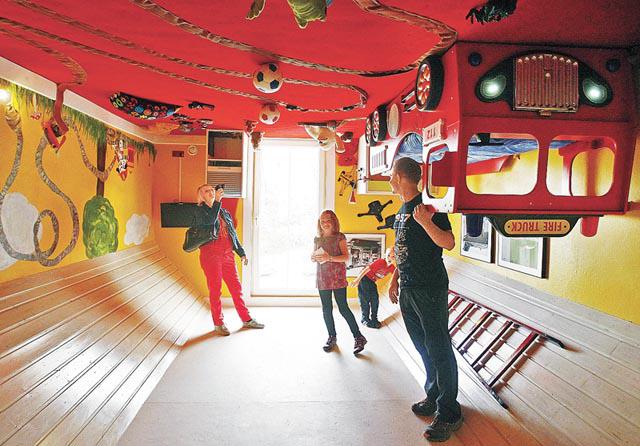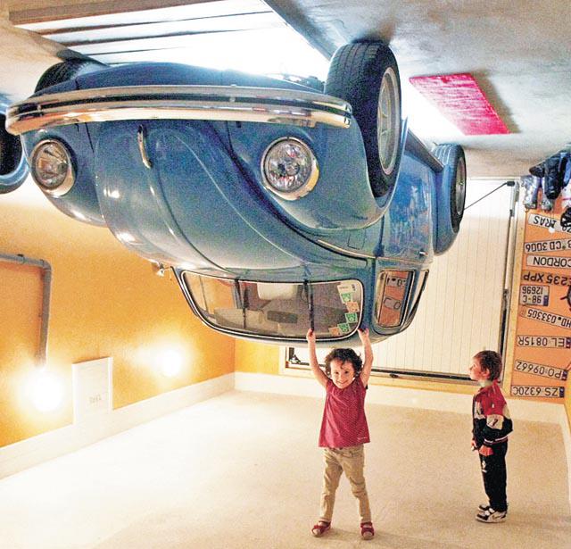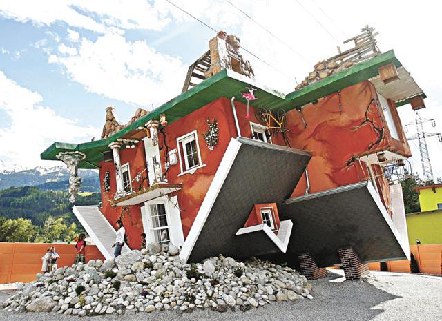 不用擔心,這間屋並非遭龍捲風吹翻再倒轉插落地,而是兩名波蘭建築師花了八個月,在奧地利因斯布魯克(Innsbruck)以西25公里一個小鎮建造的旅遊景點。從遠處看這間倒轉屋,可見到地基、部份地庫。屋內就應有盡有,只是全部都不受地心吸力影響,貼在天花板上:浴室內浴缸、廁盆等設備全部倒吊、兒童睡房內天花板放滿了亂七八糟的玩具。最誇張的是,車房竟有一輛「甲蟲車」倒吊泊在天花板。這間屋本月公開讓遊客參觀,大受歡迎。英國《每日郵報》