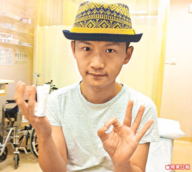 正所謂十指痛歸心,一峰痛到入心入肺,但佢仲識講笑話:「好彩傷口仲椗住塊肉,差少少就成忽肉都冇咗。」不過佢最擔心係醫生吩咐佢10日內唔可以濕水,所以唔可以為媽咪煮早餐,亦唔可以彈結他。