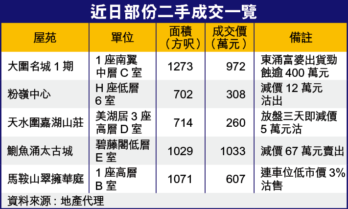 天水圍嘉湖山莊有單位放盤三天已要減價。祥益地產營業董事謝澤銘表示,美湖居3座高層D室,714方呎,原叫價265萬元,但放盤三天即減價5萬元急賣,呎價3641元。另屯門盈豐園2座中層E室,508方呎,同樣放盤三天,即減價7萬元賣出,呎價3406元。另尖沙嘴擎天半島5座高層F室,1131方呎,減價100萬元至1580萬元成交。