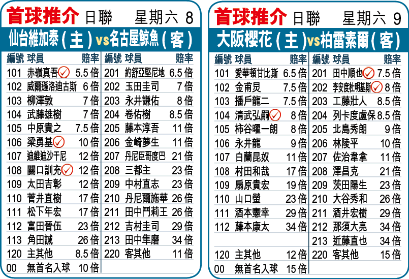 同日衞冕冠軍的柏雷素爾將作客大阪櫻花(球賽編號:星期六9;now633及660台今日6:00pm直播),前者周中於亞冠盃作客贏全北汽車2:0兼取得16強入場券後士氣大振,而且近4仗贏了3仗,狀態亦好;加上可強陣,眾主力如佐治韋拿、李安度杜明基斯及田中順也等都可披甲,作客將有中場清武弘嗣轉戰德甲的櫻花,有力全取3分而回,受讓平/半,必捧下盤,兼取客W。