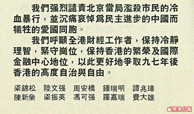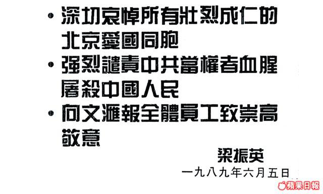 梁振英當時雖未有像上述左派紅人般籌辦或現身聲援北京學運的活動,但他在六四屠城翌日於報章刊登署名廣告,「深切哀悼所有壯烈成仁的北京愛國同胞,強烈譴責中共當權者血腥屠殺中國人民」。