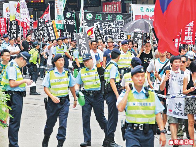 記者現場觀察,警方昨除出動過百軍裝警察,也派出至少五名便衣人員混入遊行人士之中。他們全部耳掛免提耳機或聽筒,部份手執民間團體沿途派發的宣傳單張,又經常在社民連的紙棺材附近徘徊。有人員頸上掛着相機,但用手機拍照,每隔五至十分鐘打電話,似向人滙報最新情況。一名便衣警員在遊行隊伍行經金鐘時離隊,走向一軍裝警員身旁時才掛上警察委任證。