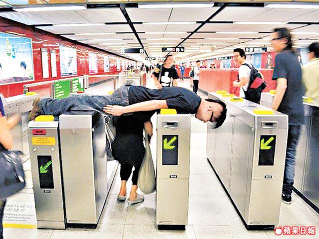 以「仆街」行為藝術,橫陳中環入閘機上,反對港鐵加價。
