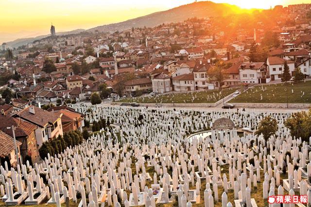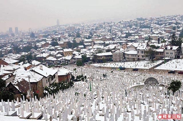 舊城區一個與民居為鄰的墓地,白雪跟白色伊斯蘭墓柱依偎。綿延的白,在屋頂上,在路旁。一個令人心冷的初夏,反常的五月雪,在4月以後散落。波斯尼亞於1992年脫離前南斯拉夫獨立以後爆發內戰,今年4月7日是內戰20周年。