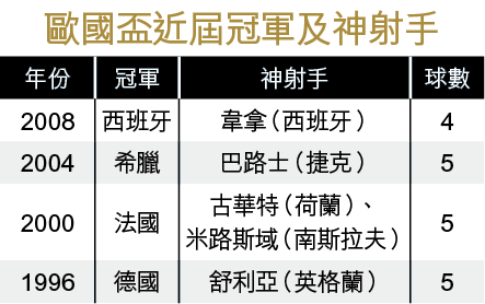 翻查歷史,自96年改制後,金靴獎得主都非來自冠軍隊,當中包括96年的英格蘭前鋒舒利亞、00年的荷蘭前鋒古華特及南斯拉夫前鋒米路斯域,以及04年捷克前鋒巴路士。然而,西班牙射手韋拿(圖)卻於上屆打破宿命,以冠軍隊球員身份奪獎。