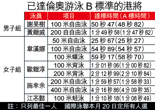 至於歐鎧淳的100米背泳已足夠她踏入倫奧門檻(見附表),但小妮子期望做出更好時間,她說:「我的倫奧A標電腦密碼已設了兩個多月,希望盡快做到。」另外,年僅14歲的何詩蓓昨以2分18秒53,刷新施幸余上周在美國做的港績。