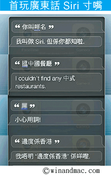 iOS6最令華人果迷興奮的特點,應是Siri終於學懂廣東話和普通話。香港WinAndMac.com報道,表示試用廣東話考考Siri,問「你叫咩名」,Siri「寸嘴」答:「我叫做Siri,但係你都知啦。」請Siri「搵中國餐廳」,Siri染了港人習氣,竟半中半英答「Icouldn'tfindany中式restaurants」。