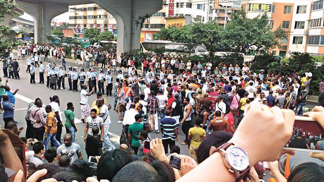 事發在昨午4時許,約20名黑人在三元里一個外貿服裝城門外聚集,高舉「還我們屍體」的英文標語示威,在當地做生意的逾千名黑人見狀馬上加入,隨後走到廣源西路,拾起路上石塊,擲向路過車輛,同時追打在場交警及公安,當局調派300名手持盾牌、警棍的防暴警察到場,將人群驅散。