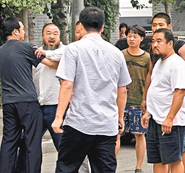 艾未未(左二)被阻止出庭,昨在工作室門外與公安理論。美聯社