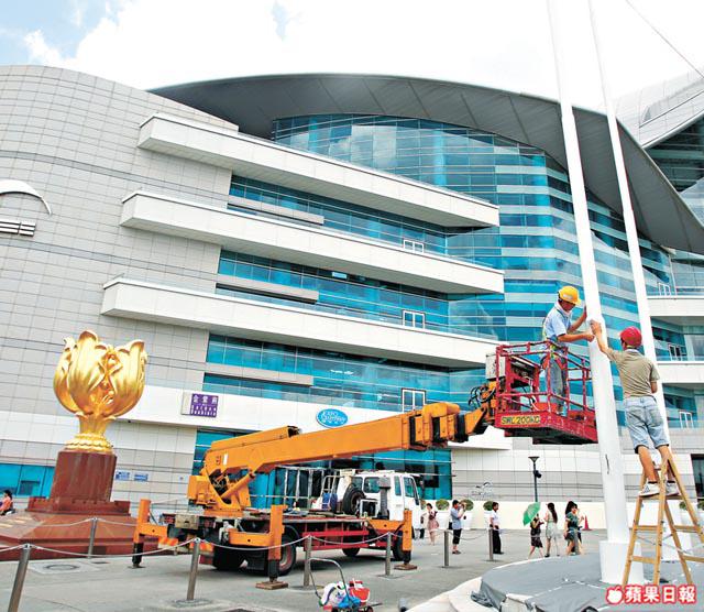 據知,會展五樓將設有警方的臨時指揮中心。另有裝修工人將灣仔金紫荊廣場的兩支旗杆重新髹油,其他清潔工人就忙於清洗會展的玻璃和外牆,而消防船則在維港綵排噴水歡迎儀式,準備「恭迎」胡錦濤。
