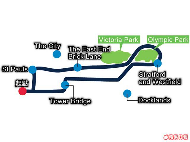 單車先經過泰德現代美術館、莎士比亞環球劇場、倫敦大橋、倫敦塔橋及Docklands等大景點,Geoffrey沿途解說倫敦的歷史後,就來到奧運之旅的起點ThreeMillsStudio,從這裏說起奧運選址落戶及發展的故事。吃過午餐後,便進入奧運會場!在會場外聽過Geoffrey訴說奧運的種種逸事,車隊經VictoriaPark、RegentsCanal及BrickLane後回程,最後返回Southbank交車!