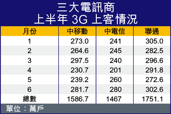 綜合三大電訊商上半年營運表現,聯通3G客共增1751萬戶,為三大之首。然而,麥格理估計,聯通今年3G上客目標4700萬戶,因此上半年上客只佔全年目標37%,為三家中表現最差的一家,該行更表示,聯通下半年平均每月要上客490萬戶才能達標。