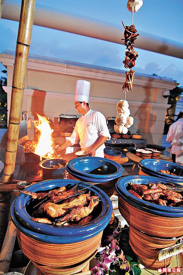 得個喝字?不成,即到以法國海邊城市命名的「貝隆餐廳」,享受夏日松露菌套餐(每位MOP1,388),當中的野菌拼松露鴨肝批,慢煮鴨肝配松露,入口極香濃;香橙松露奶酪凍也不錯,滿腔香甜美國香橙鮮味,都幾消暑。想吃BBQ?請等到7:00pm至9:00pm,「悅濤廊」有池畔燒烤派對(每位MOP488),有主廚專門替大家燒烤肉串、沙嗲、雞牛羊扒、三文魚及蒜香大蝦等等,沒錯,是悶熱了點,但美食在前,流點汗算甚麼?
