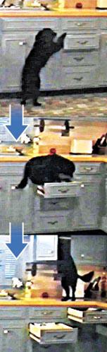 月黑風高,廚房有「飛賊」入侵,但屋主沒報警,因「飛賊」是他的愛犬。片段由屋主秘密拍攝,黑狗走進廚房,用爪拉開廚櫃第二格抽屜,跳上去站穩陣腳後,再拉第一格抽屜,當梯級踏上櫃台。黑狗隨即在櫃台面踱步,用後腳作支點,提起前腿打開吊櫃搜索,但牠突然失去平衡,「嘭」一聲跌落第一格抽屜。黑狗偷食失敗,可能驚醒主人,惟有放棄偷吃大計,跳落地面。英國《每日郵報》