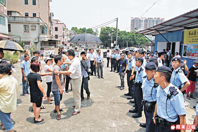 【本報訊】元朗欖口村一名原居民與村口空地的租用者合資發展農莊,昨晨偕工人到場動土,引起其他村民激烈抗議。近40名村民恐工程影響風水及阻塞出入通道,誓要阻止工人開工,雙方推撞爆發衝突,逾百警員趕至分隔兩方人馬,三人受傷,兩名男女涉傷人被捕。雙方僵持7小時後,暫時達成協議和平散去。