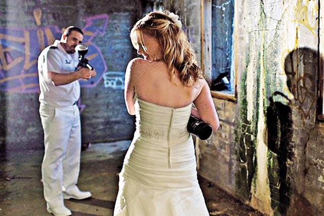 「破壞婚紗」(TrashtheDress)的風氣,年前從美國傳開,不少新娘為拍攝震撼又富美感的婚紗照,名副其實願意「赴湯蹈火」:有人穿着婚紗漂浮水中,有的則跑到垃圾場,有位新娘子更「烈火焚身」。不少男士樂於陪太太「瘋」。有對夫婦為慶祝結婚一周年,齊齊穿上結婚禮服,展開「食物大戰」,互潑紅酒。另一對則在荒廢大樓內打「野戰」──別想歪,他們真的是互射彩彈,把禮服弄得污糟邋遢,但換來一輯極具藝術美的獨特結婚照。