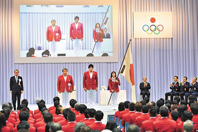 日本奧運隊成員在東京出席奧運宣誓典禮,為戰倫奧一壯行色。法新社