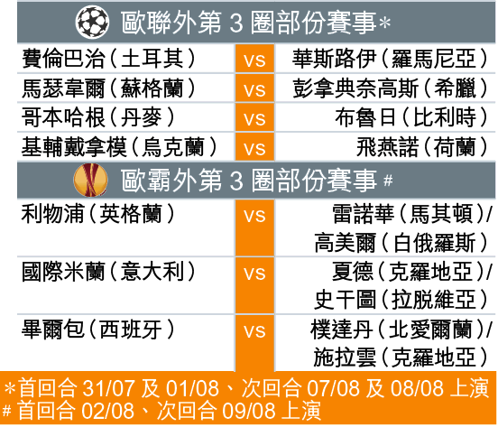 歐聯及歐霸外圍賽第3圈,周五完成了抽籤,其中烏克蘭勁旅基輔戴拿模,將要硬撼荷甲亞軍飛燕諾,相信惡戰難免。歐霸方面,不少香港球迷關心的利物浦,只抽中弱旅,料可晉級。