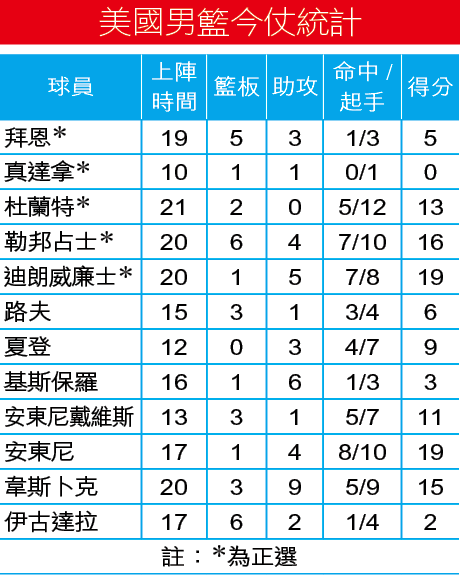英國隊為倫奧而組成,雖未至於拉雜成軍,但實力絕難與以奪金為唯一目標的美國男籃比擬。與首兩場熱身賽相比,美國隊今仗在正選陣容作出了兩個變動,前鋒杜蘭特以及控衞迪朗威廉士分別代替了安東尼與基斯保羅。結果兩人都不負所託,杜蘭特為美國攻入13分;迪朗表現更醒神,全場8投7中,包括命中5個3分球拿下全隊最高的19分,證明自己有實力佔據正選席位。