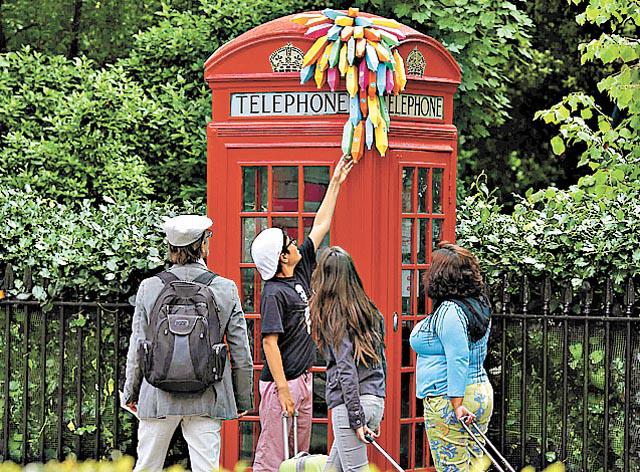 倫敦電話亭上掛上香蕉,作為展望4年後於巴西里約熱內盧主辦的2016年奧運的活動之一。路透社