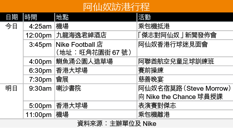 阿仙奴戰罷曼城之後,已立即在昨晚乘包機抵港,備戰明午5時在香港大球場對傑志的表演賽。兵工廠一連兩日的訪港活動,雖然行程緊密(見附表),但其實公開活動不多,如欲近距離一睹偶像的風采,除了在酒店碰運氣外,首推今午在旺角NikeFootball店舉行的見面會。