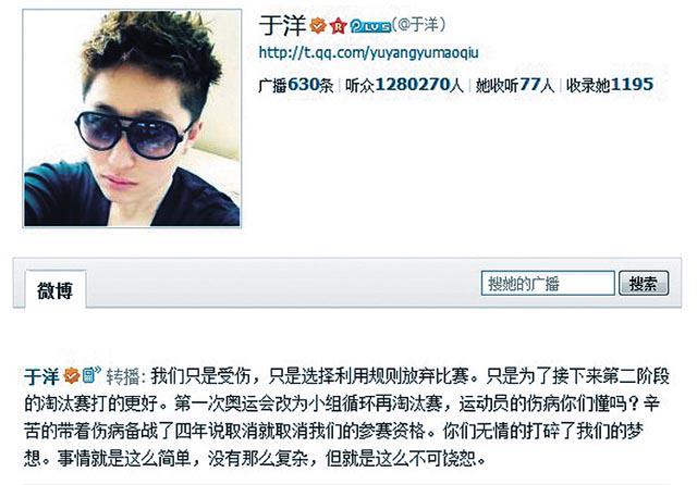 但兩人之後在微博留言顯得不忿。于洋留言:「我們只是受傷,選擇利用規則放棄比賽是為了淘汰賽。」她反問:「運動員的傷病你們懂嗎?辛苦的帶着傷病備戰了四年,說取消就取消我們的參賽資格。你們無情的打碎了我們的夢想。」她又說:「這也是我最後一次比賽了。再見國際羽聯,再見我摯愛的羽毛球。」沒多久,王曉理又在微博發炮:「我真的沒想過辛苦了四年的結果是這樣!滿身都是傷!為了比賽一再堅持!你們不完善的賽制卻要我們買單(付出代價)!憑甚麼?你們取消的不只是一場比賽!而是我的夢想!」