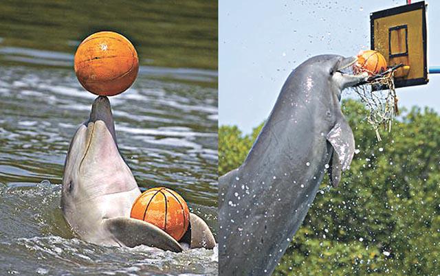 在奧運熱潮下,海豚都想湊熱鬧?這條海豚住在古巴一個海洋動物保護區,最愛打籃球,訓練員給牠籃球,牠就會鼻子頂波射籃入樽(右圖),幾乎每射必中,樂在其中。這條海豚更是籃球高手(左圖),入籃後會滑水慶祝。斯洛文尼亞遊客隆吉說:「那海豚接到籃球後顯然很高興。我嘗試拍下最佳照片,但表演太精采了,我忘了集中精神拍照。看見海豚像人那樣跳躍、玩耍、跟訓練員互動,嘆為觀止。」英國《每日郵報》