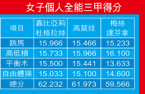 談到美國體操的發展越來越好,頂級選手亦浪接浪,喬良說:「美國體操的基礎打得好,全國有很多體操會。很多孩子從小都去體操會練習,但有很多並非為了贏冠軍,只是為了強身健體,提高自己身體的平衡性。」俄羅斯的高莫娃繼於女團後,再於女子個人全能取銀牌,故不禁再次淚流滿面。她說:「我很傷心,因我本來應可贏得金牌。」