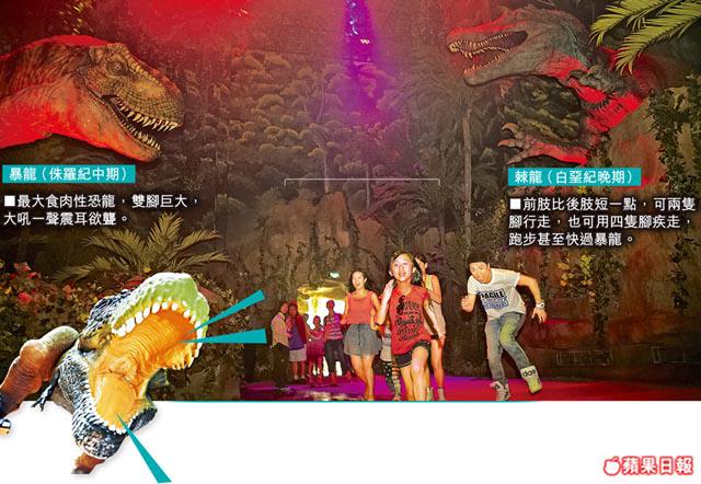 接近最後一個山洞,忽然傳來低沉的震耳叫聲,是暴龍!剛才還得意洋洋大喊:「啲恐龍假嘅!」兼得戚擺Pose拍照的小朋友,即時驚得縮作一團,某小朋友還紮行馬大喊不肯前行,阿媽死拖他走也無符。入到山洞,終於見到全森林最大、高五米長十多米的一比一暴龍,牠在狂吼狂叫,轉頭時,金黃色的眼睛也跟着轉,一摺摺的下巴在緩緩晃動,青筋暴現一副挑釁神情,對面的巨型棘龍極速現身,兩隻恐龍在嘰嘰呱呱叫,加上古怪的燈光,情景真實得來又確實有幾分恐怖。