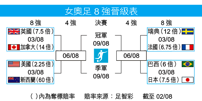 美國女奧足在G組以3戰全勝姿態殺入8強,周五於聖占士公園對陣僅在E組以第3名出線的新西蘭,牌面絕對在對手之上,捧美國[-1]「主勝」應坐定粒六。(球賽編號:星期五2;有線18、63及203台今日9:30pm直播)