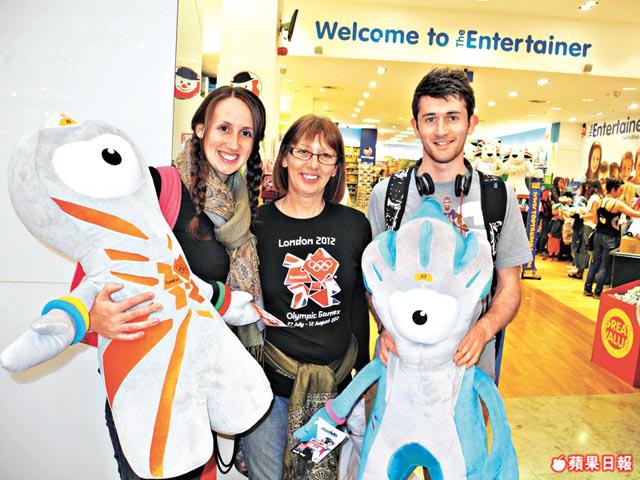 來自倫敦的3母子Denise、兒子Tom及女兒Kim,各持大大隻吉祥物公仔,他們說:「我們一直都留意倫奧的精品,但像我們手中這隻大公仔,原價300鎊,現在減到20鎊,真是抵到爛。」