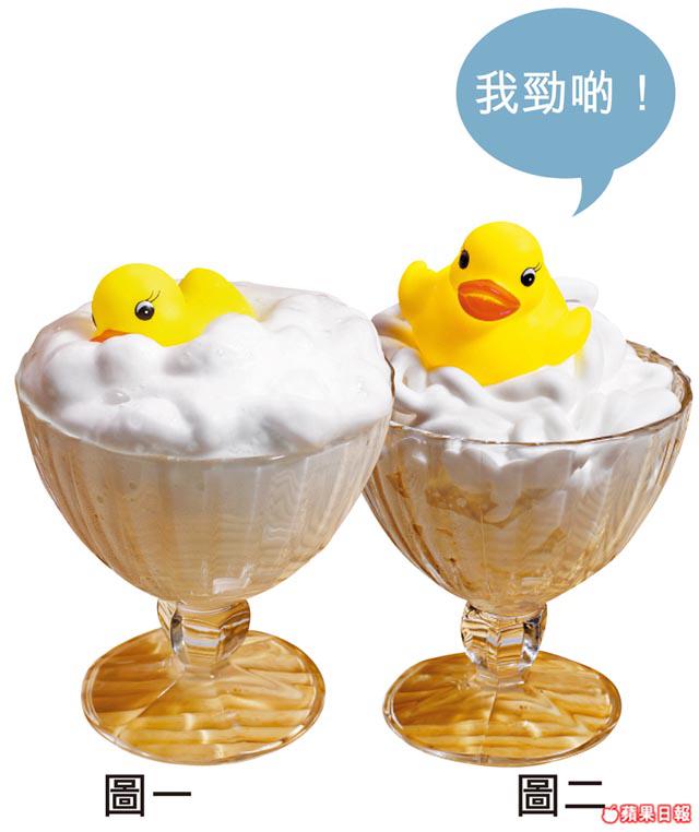 點樣為之一支優質的CleansingFoam?最緊要係泡泡夠彈性。我們在日本資生堂潔膚科研開發專員目野高嗣先生的教路下,做了個小實驗。分別在兩個玻璃杯中擠出相同份量的泡泡,然後放上鴨子,圖一的鴨子很快便沉下去,反觀圖二的鴨子仍浮在泡泡面。目野高嗣先生表示,越濃密和高彈性的泡泡,才有效黏走污垢及化妝殘迹。