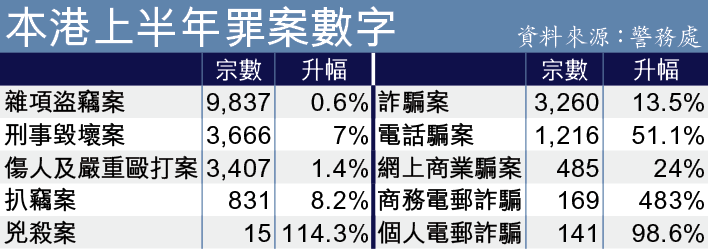 此外,警方公佈今年上半年詐騙案顯著上升,其中電話騙案逾1,200宗,升幅達五成,主要涉及虛構綁架或「猜猜我是誰」,共拘捕7名內地人士。商務電郵騙案急升五倍,涉及金額6,146萬港元。警方會成立網絡安全中心,由一名總督察帶領共27人的編制組成,年底開始運作,打擊網上罪案。