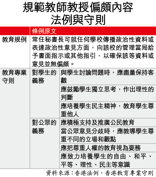 教育局回應稱,近年沒引用上述規例向學校發書面指示,條文精神是當課程內容或活動涉及爭議性政治議題,學校應盡量表述事實,提供多角度資料。