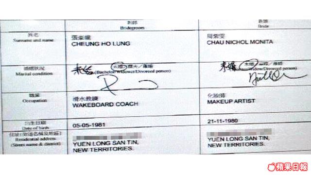 根據婚姻註冊處的資料顯示,張豪龍的未婚妻是大他5個月,同樣是31歲報稱是化妝師的女友周紫雯。在登記的擬結婚通知書上列明兩人都是未婚,不過他們報住的地址同是位於元朗御葡萄的獨立屋,揭露他們同居關係。此外,有讀者報料指報稱為攝影師的周柏豪於上月24日登記註冊,報住的地址為將軍澳。所有入紙的結婚申請需要於3個月內完成。