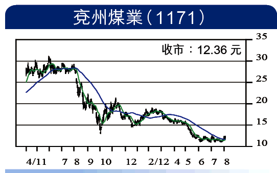 今年6月17日推介中煤能源(1898),入市位及目標價皆順利達到,按目標價及最高位計,分別升10.6%及16.2%。今周推介同類股兗州煤業(1171),比較中國神華(1088)及前者,升幅明顯遜色,近期內地煤價見底回升,有利煤股表現。兗煤現價市盈率5.5倍,息率5.67厘,估值便宜。12元附近吸納,目標13.8元,跌穿10.7元止蝕。