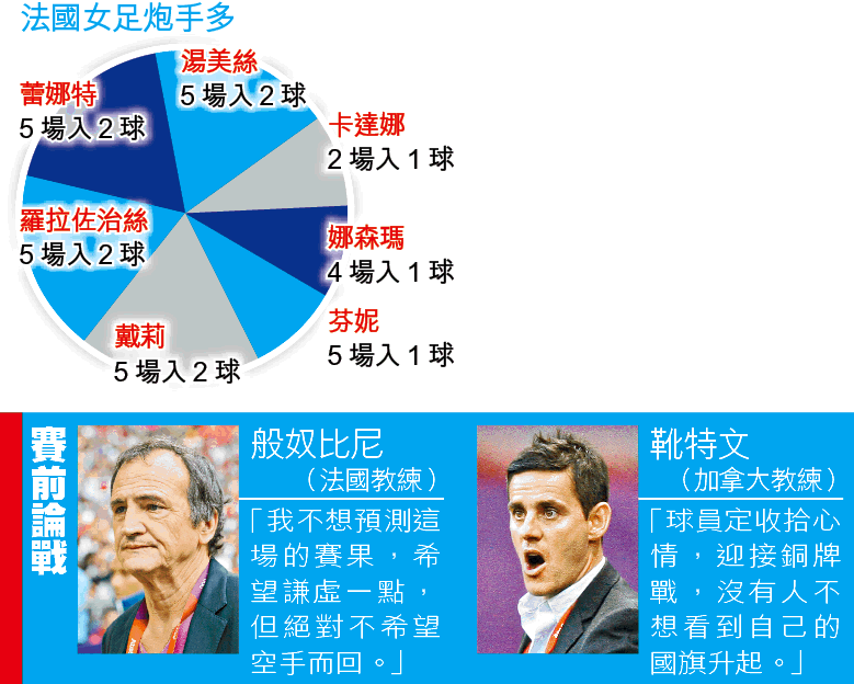 對手法國另一仗1:2負日本,無法首次晉級奧運便闖入決賽,但今屆演出已令人留下深刻印象,而且這場準決賽,法國的攻勢甚至較日本更旺盛,若非隊長布莎莉亞在下半場尾段12碼不入,比賽或要延至加時才決勝負。法國迄今5戰已入11球,而且多達7名球員有入球,證明入球分佈十分廣(見附表),勢令加拿大十分難防。