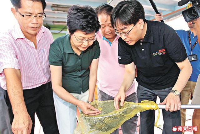 林鄭月娥與食物及衞生局局長高永文,昨午視察膠粒污染重災區大嶼山南的芝麻灣,漁業界代表向官員反映事件影響生計,漁民即時劏開一條星鱸魚,發現魚的內臟有小量膠粒,並展示連日來在養殖區撈起的大量膠粒。