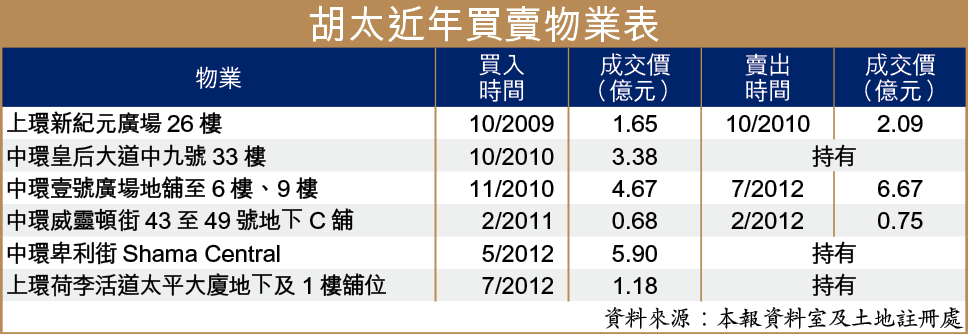 胡太鐘意跳舞、畫國畫就係人都知,估唔到投資物業亦有一手,但就唔係一開始有錢賺。翻查紀錄,胡太08年開始高調投資物業,一出手已經拎成4.6億,買起兩層上環中遠大廈同一層灣仔順豐國際中心寫字樓。