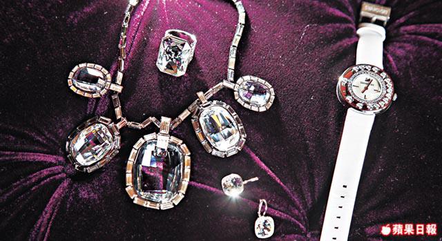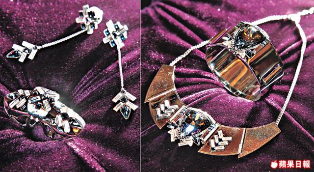 Swarovski秋冬系列以音樂作為繆思,新作以實黑及炭灰為主,切割多用三角及方形,chunky設計表現華麗國度中貴族的搖滾新貌。林嘉綺謂配襯巨型飾物很簡單,不可貪心:「想別人將視線停留在臉上,在巨型耳環或頸鏈中,只挑一個。」